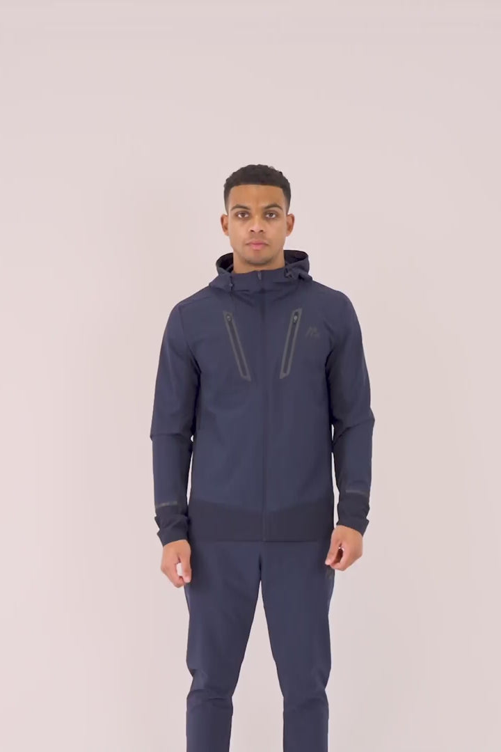 Standard fit, stretch woven fabric, charcoal branding, adjustable hood for comfortability, zip chest and body pockets for secure storage, and contrast panel detailing deliver performance and style.